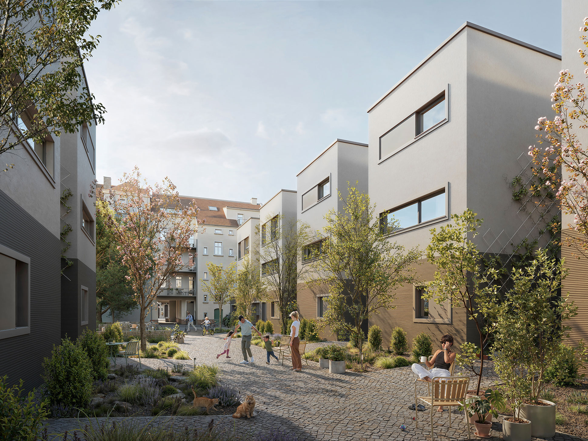 Alle Wohneinheiten im Erdgeschoss verfügen über einen Zugang zur Außenanlage, die nach einem modernen Gestaltungskonzept passend zum Gebäude erstellt wird. Dazu gehört auch die Gestaltung der Außenterrassen, die wie auch die anderen Bereiche der Gartengeschosse eine Klinkerfassade erhalten.